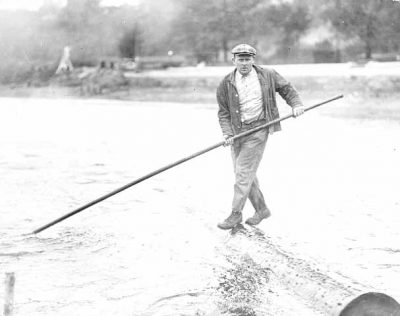 Poling logs downstream (what kind of balance did these guys have? Freezing water dunks are no fun.)